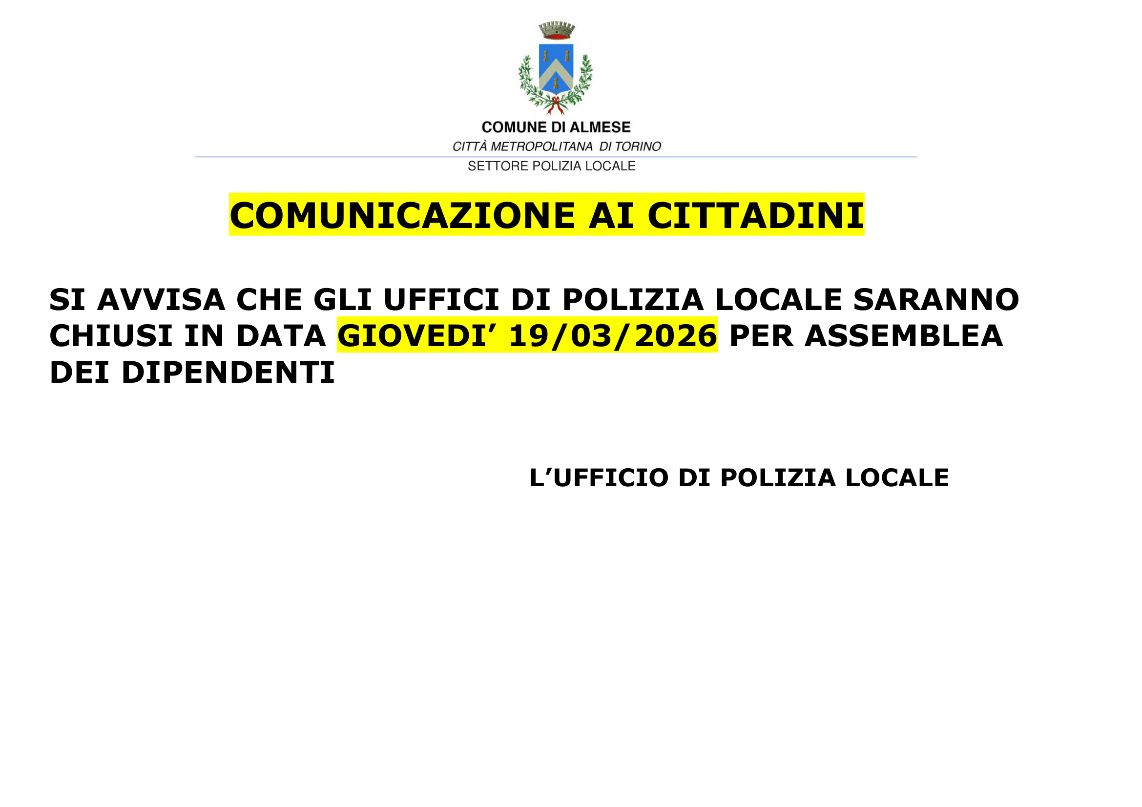 Gli Uffici di Polizia Locale resteranno chiusi giovedì 19/03/2026