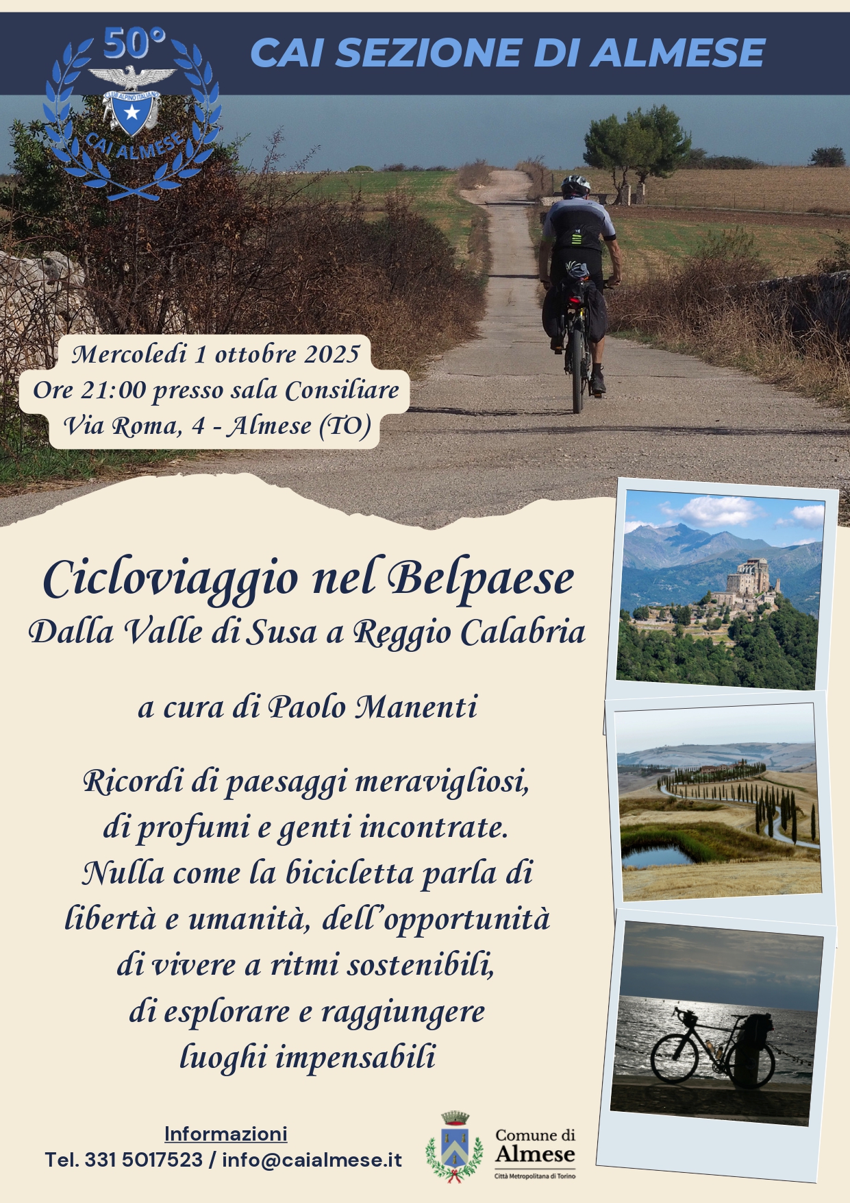 Mercoledì 1 ottobre alle ore 21:00 presso la Sala Consiliare di Almese (Via Roma 4), la serata “Cicloviaggio nel Belpaese – Dalla Valle di Susa a Reggio Calabria” a cura di Paolo Manenti.