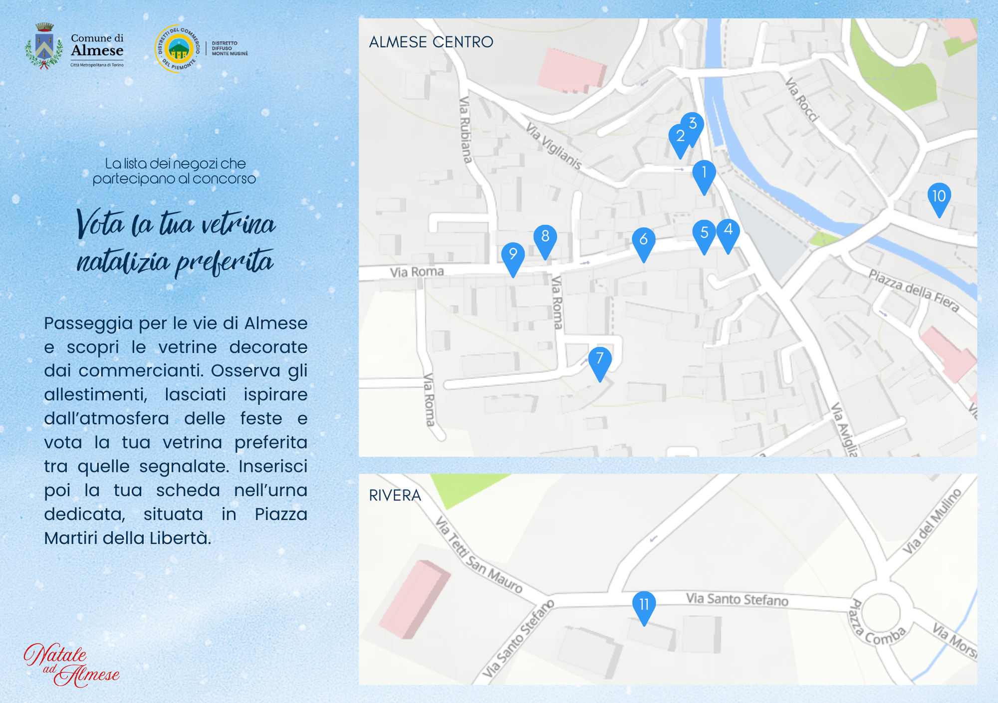 Osserva gli allestimenti, lasciati ispirare dall’atmosfera delle feste e vota la tua vetrina preferita tra quelle segnalate. Inserisci poi la tua scheda nell’urna dedicata, situata in Piazza Martiri della Libertà.
