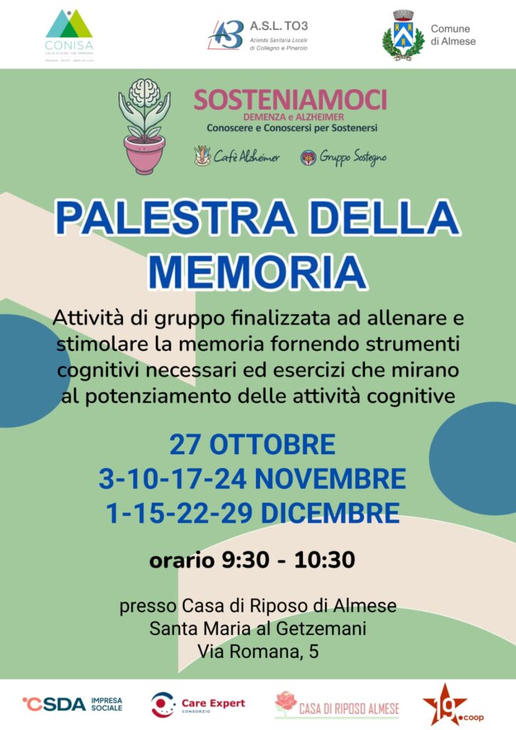 Sempre nell’ambito del progetto “Sosteniamoci”, partirà anche l’iniziativa “La palestra della memoria”, che si terrà presso la Casa di Riposo Santa Maria al Getsemani di Almese nelle seguenti date: 27 ottobre, 3-10-17 e 24 novembre, 1-15-22 e 29 dicembre 2025. Le attività, a ingresso libero, saranno dedicate a persone che iniziano a manifestare difficoltà di memoria, sensoriali o i primi segni di demenza, e prevedono esercizi educativi e momenti di socializzazione. L’iniziativa è aperta sia agli ospiti della struttura sia a persone esterne interessate a partecipare.